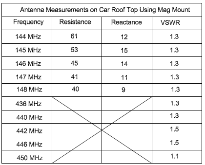 The antenna measurements are shown in the table. The 146 MHz range used an antenna analyzer capable of measuring the real and imaginary components of the impedance. The 440 MHz could only have its VSWR measured.